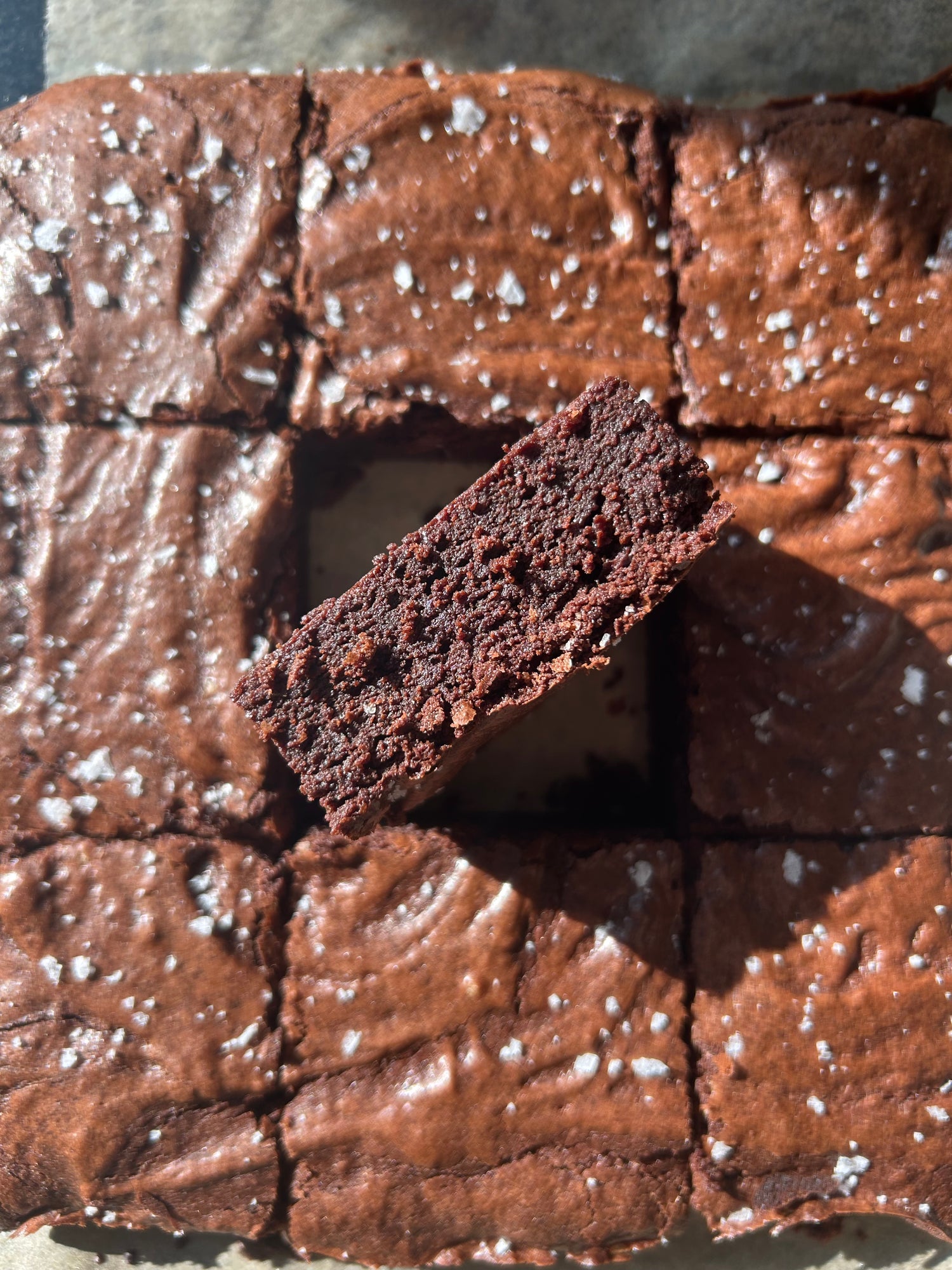 Organic brownies made with fermented cacao powder, sprinkled with spring salt.